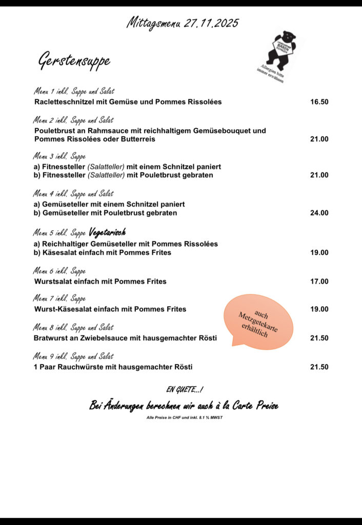 Zur Metzgetekarte Am Dienstag, den 23. September 2025 starten wir mit der Metzgete.11.00-13.30 Uhr und 18.00-21.30 Uhr2. und 4. Sonntag im Monat von 11.00-16.00 Uhr. Da es ein frisch Produkt ist, hat es immer so lange es hat, wir versuchen jedoch immer unser Bestes zu geben dass es aufgeht 🙂Aber es kann auch mal vorkommen das es an einem Sonntag oder Dienstag Mittag keine Blutwürste mehr hat.. Wir freuen uns auf eure Reservation d‘ Familie Wernli mit dem Bärenteam