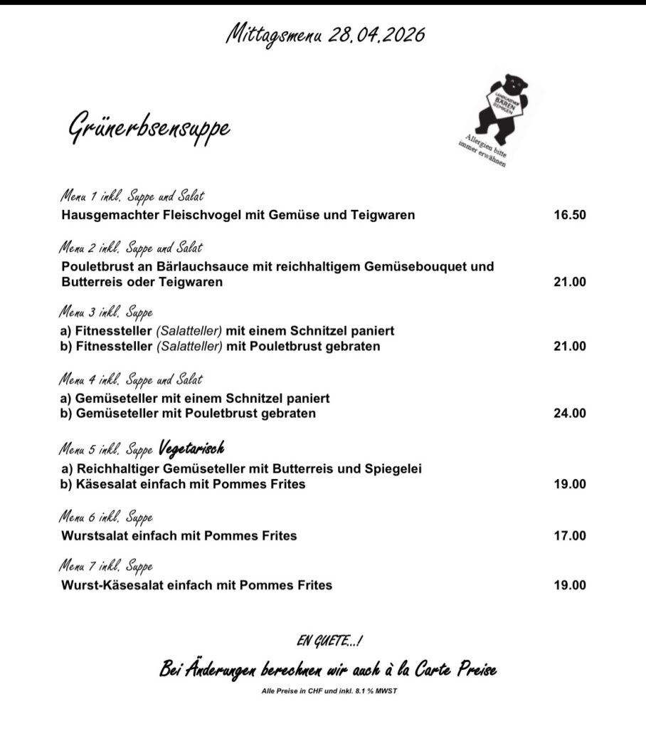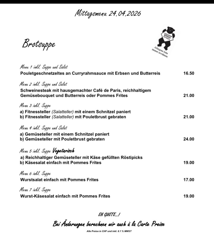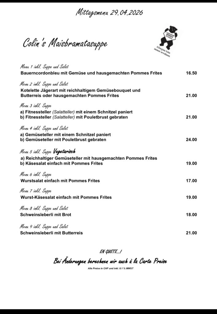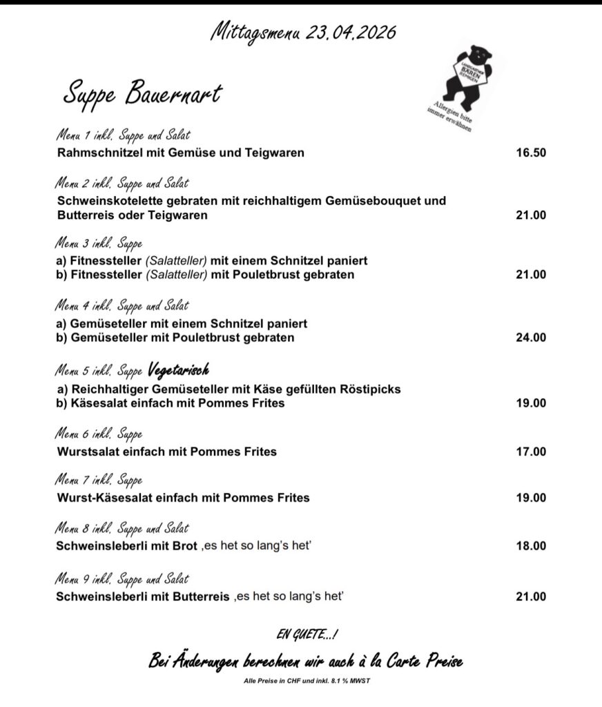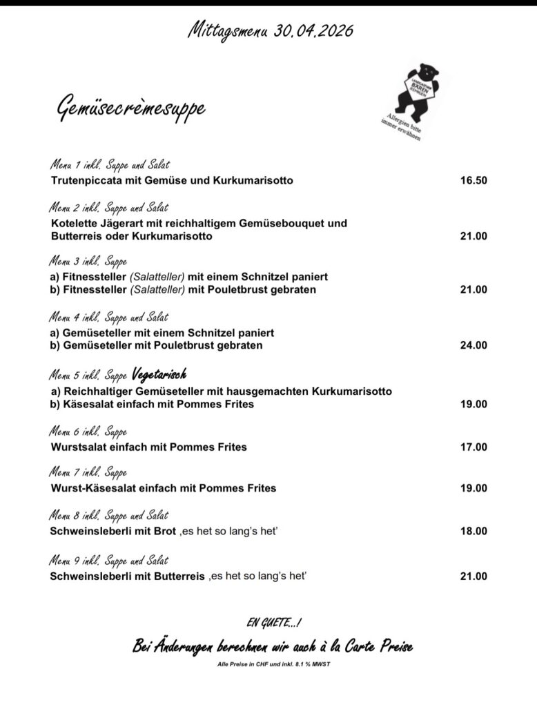 Kellermiete CHF 80, zzgl. CHF 5 pro Menü
