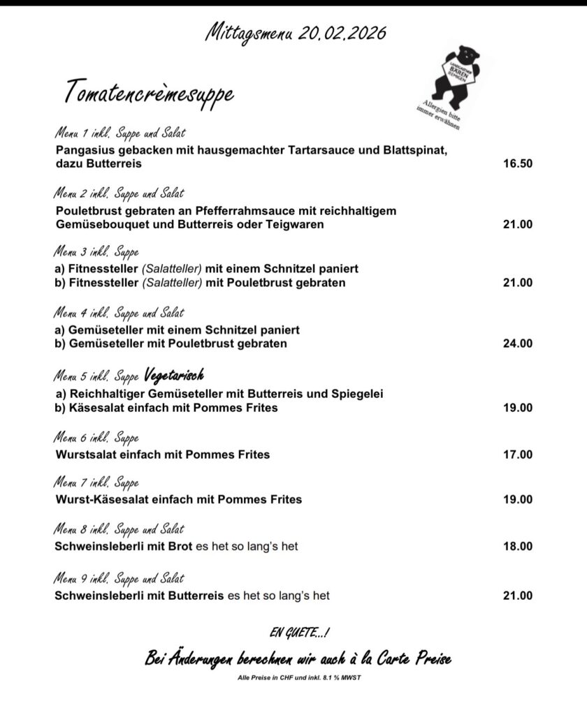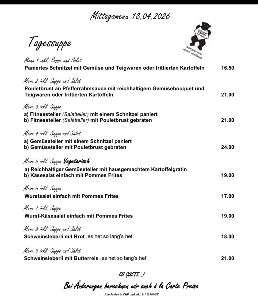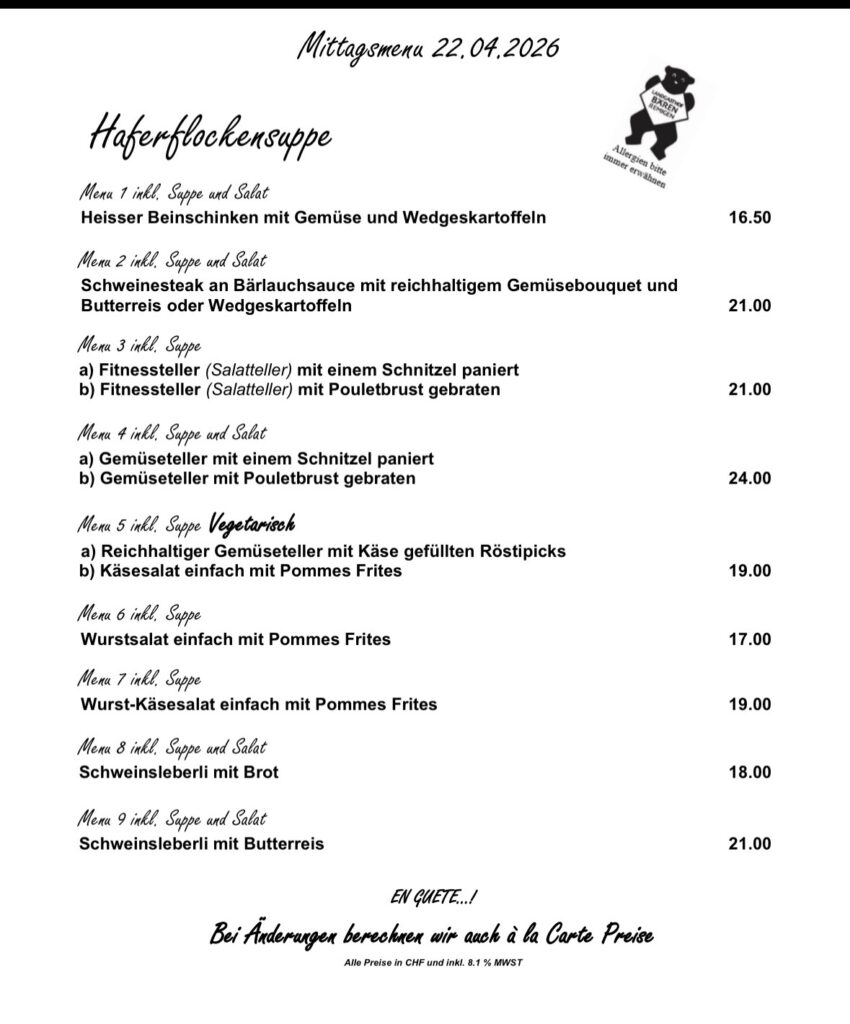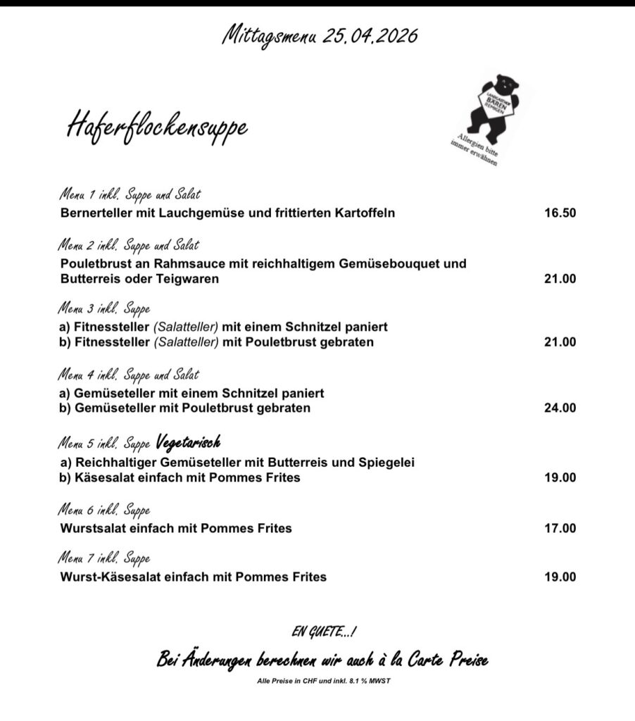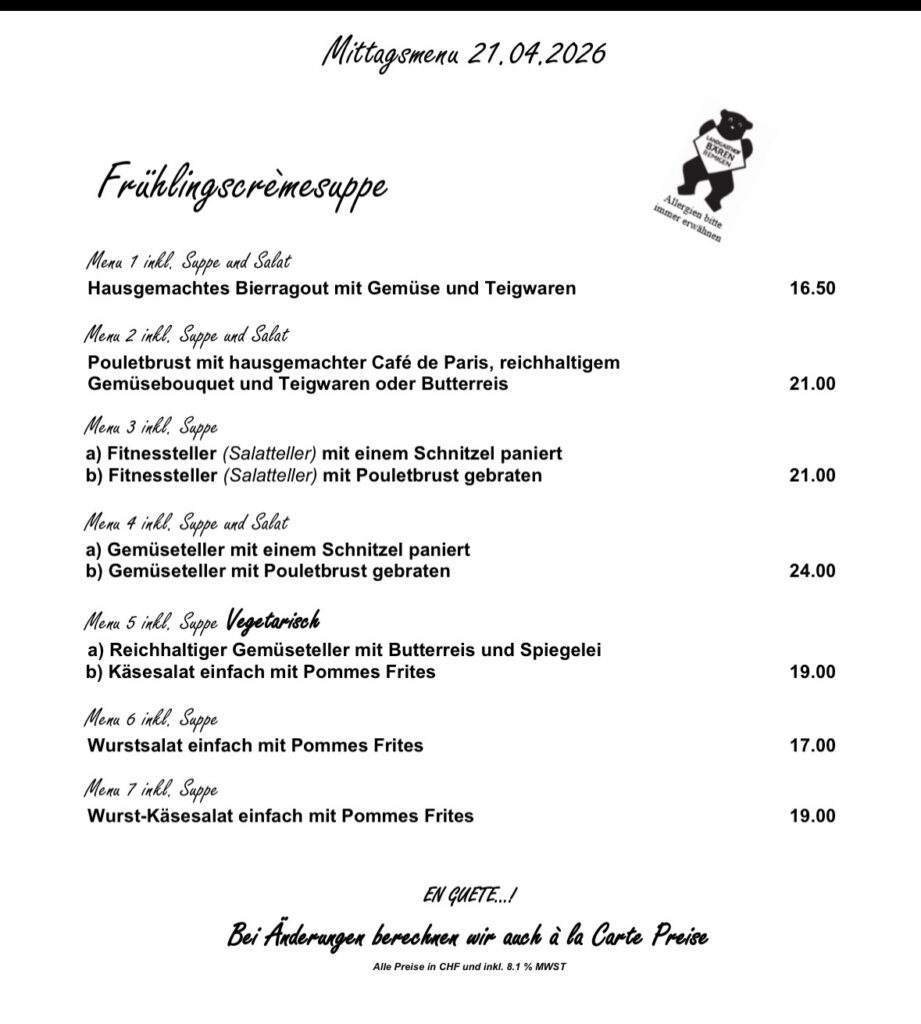 Kellermiete CHF 80, zzgl. CHF 5 pro Menü